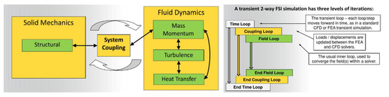 ANSYS Mechanical is a CAE (Computer Aided Engineering) software that simulates structural responses by the finite element method. The simulation analysis includes structural strength, stress, vibration, etc., and it can be combined with other ANSYS software for coupling analysis. In some cases, the fluid flow will cause the displacement of the solid, and the displaced solid will change the flow field of the fluid. Fluid–structure coupling is divided into one-way (1-way) and two-way (2-way) fluid–solid coupling. One-way fluid–solid coupling is to treat an already calculated result as another boundary condition to be calculated. Bidirectional coupling is divided into fully coupled, implicit, and explicit coupling. Full coupling calculates the simultaneous equations of fluid and solid as a matrix, which is often difficult to be solved. Implicit coupling is generally used by iteration until the convergence target is reached. Explicit coupling requires very a small time step and is very time consuming; therefore, it is not recommended. Figure 2 shows the FSI (Fluid-Structure interaction) module of ANSYS, and the implicit method was chosen in this study to perform the fluid–structure coupling analysis.