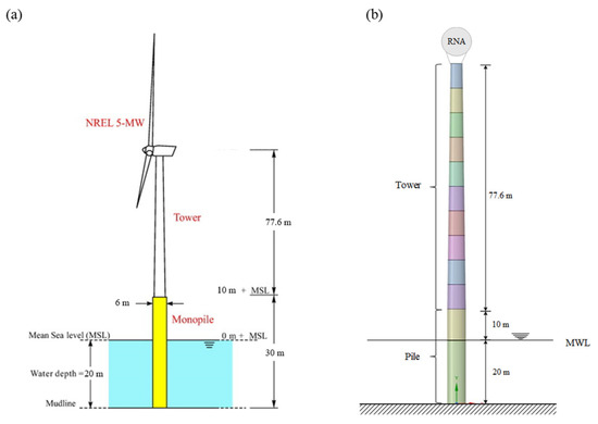 (a) The 5 MW offshore wind turbine (OWT) developed by NREL; (b) a simplified OWT model.