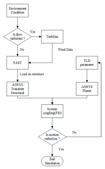 To reduce the dynamic response of the OWT, a TLD is installed at the top of the OWT. Figure 4 shows the simulation chart. To perform the simulation, the environmental loads were determined first. Since the turbulent wind field was considered, the TurbSim was used to generate a turbulent wind field, and then we input the obtained data to FAST. Then, the force data generated by FAST was input into ANSYS Transient Structural. The TLD geometry was determined based on the tuned frequency of TLD. We used ANSYS Fluent to simulate the sloshing flow in TLD, and then we used system coupling to complete the fluid–structure coupling simulation.