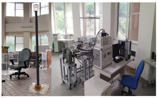 Before presenting the numerical simulations made in this study, the experimental measurements were performed to validate the simulation results obtained in this study. A simple experimental model (shown in Figure 5) was set up. The supported tower was a 3-meter height PVC pipe with a diameter of 12 cm. The RNA (rotor nacelle assemble) was replaced by a lump weight of 1 kg. The cylindrical TLD was set at the top of the RNA. The density, Young’s modulus, and Poisson’s ratio of the PVC pipe are, respectively, 1532 kg/m3, 3070 MPa, and 0.4. As illustrated in Figure 6, the OWT model was set on a shaking table that can be moved back and forth with an AC motor. The maximum moving distance (r) of the shaking table is 30 mm, and the highest revolutions of the motor is 2000 r.p.m. The AC motor can reciprocate according to the programmed displacement path and frequency. The motion trajectory of the instrument is based on the sine wave. With a maximum amplitude of ±5 mm reciprocating movement, a circular platform is attached to the square platform on which the OWT was installed. A Keyence laser displacement meter is set at the proper elevation to measure the time history of displacement of the RNA.