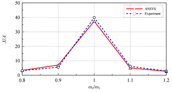 The comparison of ANSYS simulated results and the experimental measurements; X/A: the dimensionless displacement of OWT; ωx/ωs = 1: excitation frequency (ωx) is equal to the natural frequency of OWT (ωs).