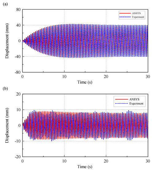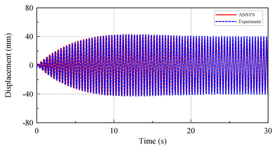 To confirm the accuracy of experimental measurements, the fundamental frequency of the scaled OWT model was checked. The base platform was excited by a harmonic force, F(t) = Aωxsin(ωxt), where A is the amplitude of the excitation and ωx is the excitation frequency. ANSYS was used to calculate the corresponding dynamic displacement response. The ANSYS FEM-Modal set up was based on the experimental model, and the natural frequency of the model was calculated. The calculated natural frequency (2.751 Hz) is very close to the experimental measurement (2.75 Hz). Figure 7 clearly shows the agreement of the simulation and experimental results, and the peak dimensionless displacement occurred when the exciting frequency (ωx) is equal to the natural frequency (ωs) of the model, i.e., ωx/ωs = 1. Figure 8 shows the comparison of the dynamic displacement obtained by ANSYS simulation and those of the experimental measurements and the agreement is also very good. The dynamic displacements measured in this section were also used as a reference to evaluate the effects of TLD on the response reduction of the OWT.