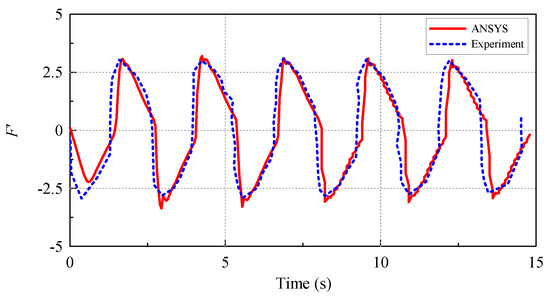 In the ANYSY fluid–solid coupling, the accuracy of the hydrodynamic force calculation is important, and Fluent may correctly transmit the force of the fluid acting on the tank wall to the structure. Figure 9 illustrates the comparison of the Fluent-simulated force with the experimental measurements of Krabbenhøft (2011) [20], and the agreement is very good.