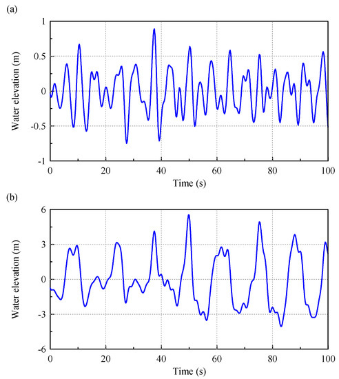 In FAST, HydroDyn is used to calculate hydrodynamic loads. The regular wave and irregular wave can be selected. In the wave condition of fatigue load, an irregular wave is selected. The PM wave spectrum was selected for the normal sea state, whereas the JONSWAP spectrum is selected for the ultimate load condition, because the JONSWAP spectrum can show the characteristics of extreme sea conditions. Figure 15 shows the wave histories of normal and extreme sea states.