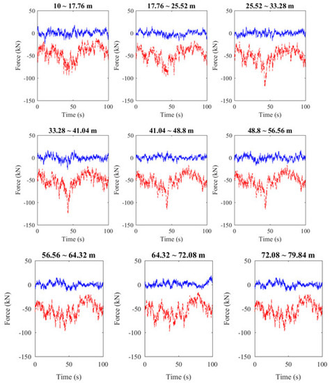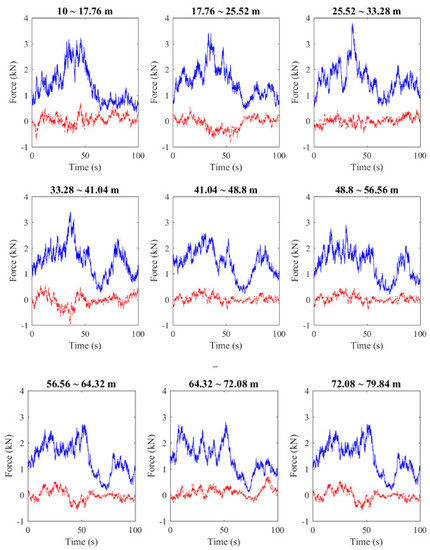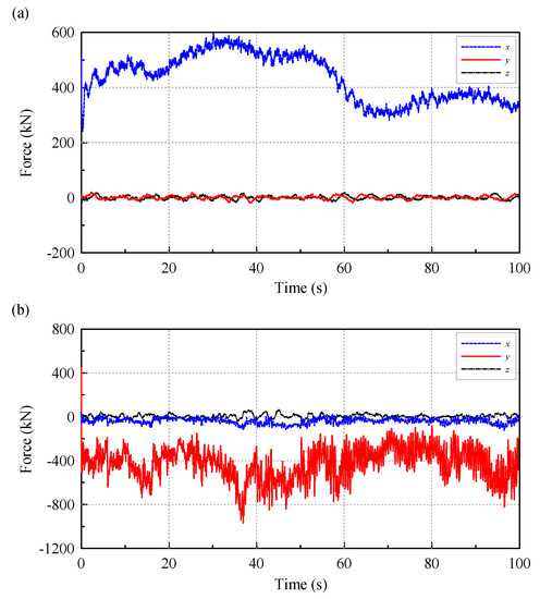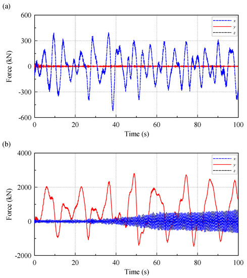 For the wind field condition of DLC 6.2, the Uref is changed to 54.16 m/s, and the generated file was submitted to AeroDyn to expand into a global wind field. In the AeroDyn, the direction of the wind can be set. In the case of the annual average wind speed of the wind field conditions of the DLC 1.2, the wind turbine directly faces the windward direction, so the wind direction angle is set to 0°. In the extreme load DLC 6.2, the side winds of the 10-year average extreme wind speed and the 50-year regression period are blown toward the blades, so the wind direction angle is set to 90°. Figure 13 shows the wind speed in three directions with an annual average wind speed at 90 m elevation. Since the annual average wind speed is blown toward the wind turbines, the wind speed in the x direction is greater than the other two. Figure 14 shows the corresponding 10-min average extreme wind speed in a 50-year regression period. The wind field is designed to have a crosswind effect on the wind turbines, so the wind speed in the y direction is the largest. The fatigue load in DLC 1.2 is in normal operation, and the turbine blades rotate normally, but in the DLC 6.2 limit load condition, the wind turbine is parked because of excessive wind, and the blade is turned parallel to the wind to reduce the force on the blades. Meanwhile, in the FAST setting, the blades are parked, and the blade angle is set to 90°. Therefore, we may expect that RNA has larger force in the x direction, whereas at extreme wind speeds, RNA has larger force in the y direction, since the wind blows from the y direction.
