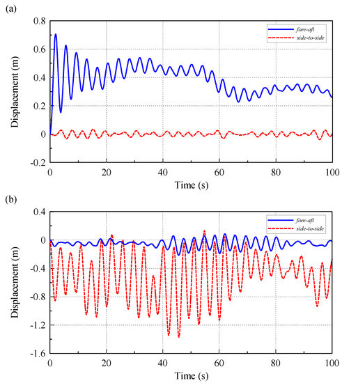Displacement of RNA for an OWT under the DLC 6.2 condition: (a) fore-aft movement; (b) side-to-side movement.
