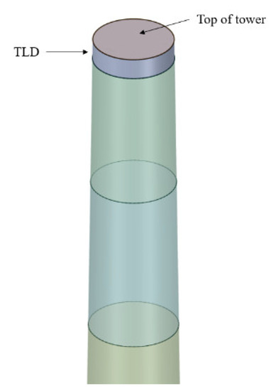 The monopile offshore wind turbine is subject to wind and wave loads, which may cause dynamic responses of the structure. This study tried to install the cylindrical TLD on the top of the offshore wind turbine, as shown in Figure 21, to suppress those responses. The diameter of the TLD is 3.846 m, which is about the same size of the inner diameter of the tower top. The natural frequency of the liquid in the cylindrical tank can be calculated by . The water depth of TLD can be determined when we tune the natural frequency of TLD to be equal to the natural frequency of the structure; then, the water depth of TLD = 0.35 m was calculated.