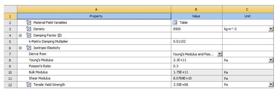 The mechanical properties of the OWT are shown in Figure 22. The OWT model is drawn by ANSYS SpaceClaim and TLD was also added, which were all input to the Transient Structural. In the Transient Structural, the parameters of the material such as density, Young’s modulus, and damping coefficient, etc. were set. Then, the FAST-calculated wind and wave loads were input. The fluid–solid coupling interface was set as shown in Figure 23.