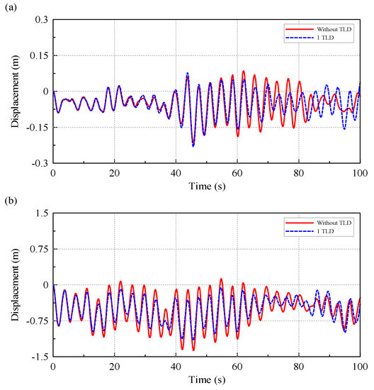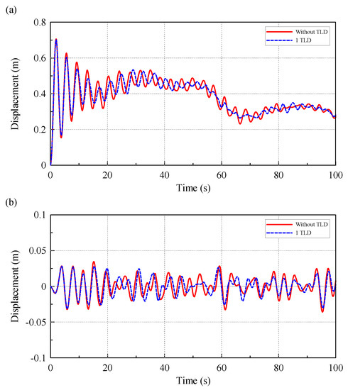 Dynamic displacement of RNA of OWT: (a) without TLD; (b) with TLD.