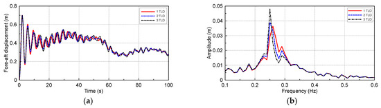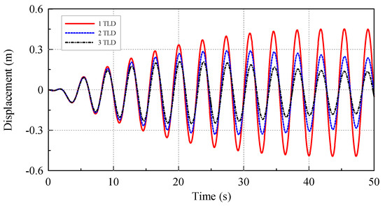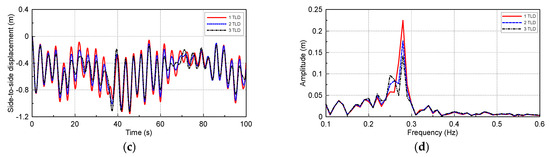 In the previous section, one TLD presents mild motion reduction effects on OWT when it is under DLC 1.2 and DLC 6.2 load conditions. As reported in Chen and Yang’s study, the best damping effect of TLD on the structure might occur when the natural frequency of TLD is tuned to the natural frequency of the structure. Since the OWT is a slender structure and the natural frequency is small, therefore, the water depth of the liquid in TLD is also small. The damping effect of a single TLD might be limited. Then, we increase the number of TLDs, which all have same natural frequency as the natural frequency of the structure. Figure 27 shows the motion reduction effect of multiple TLDs on OWTs when it is under harmonic ground excitation, and the 3-TLD has the best motion reduction effect, which is nearly 100% better than that of the 1-TLD.