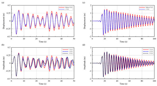 The side-to-side displacement of the OWT with various TLDs: (a) and (b), El-Centro earthquake; (c) and (d), Chi-chi earthquake.