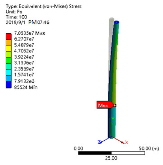 Figure 30 shows the location where the maximum stress occurs in the absence of TLD according to ANSYS simulation. This position is the intersection of the tower and the pile. Then, we made the fatigue analysis of the stress at the junction of the tower and the supported pile. Figure 31 shows the time series of the maximum stress at the intersection of the tower and the pile.