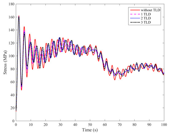 The comparison of the history of the stress at the interaction of the tower and pile of the OWT with various numbers of TLDs.