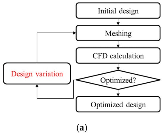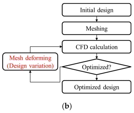 Procedure of computational fluid dynamics (CFD)-based optimization. (a) Re-meshing method. (b) Mesh deforming method.