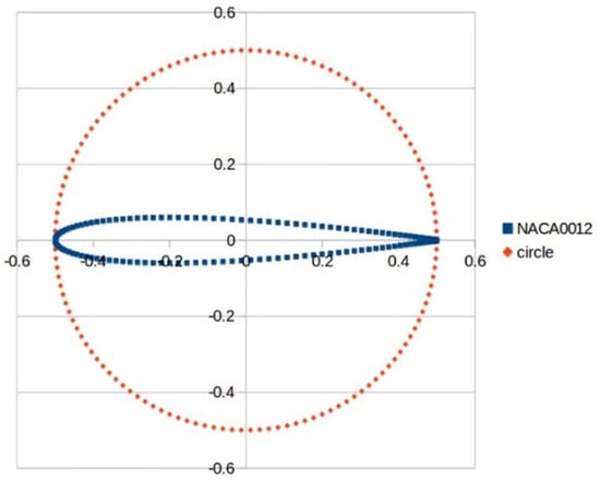 In this section, the RBF and IDW methods are introduced and compared. In addition, an improved RBF method to remedy its shortcomings is proposed. A mesh for a circular cylinder was deformed to the mesh of NACA 0012 using the RBF, IDW, and proposed methods. The red points in Figure 2 denote the control points on the surface of the circle and the blue ones indicate the displaced points on the surface of NACA 0012. The number of control points is 256 and the points move only in the vertical direction. The vertical movements make the normal vectors of the boundary faces rotate.