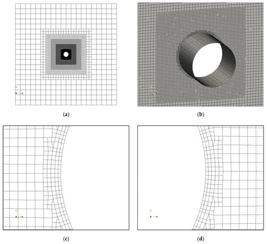 The initial grid for the circular cylinder is shown in Figure 3. The grid is a polyhedral mesh generated using snappyHexMesh, a standard built-in utility of OpenFOAM (The OpenFOAM Foundation Ltd., London, U.K.). The number of cells is 103,160 and the thickness of first boundary layer cell is 1% of the cylinder diameter. The top, bottom, right, and left boundaries were set as fixed boundary conditions. The front and back boundaries were set as symmetric boundary conditions. To satisfy the fixed boundary condition, the grid points of the fixed boundary were added to the control points. The displacements of the fixed boundary were set as zero.