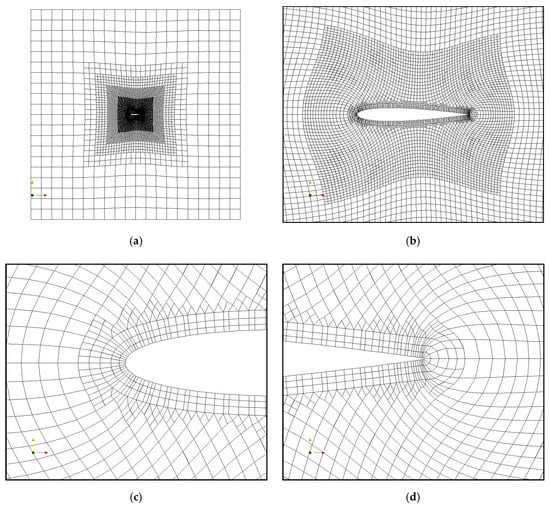 Deformed mesh using the RBF method with additional control points. (a) whole domain (side view), (b) near body (side view), (c) around leading edge (side view), (d) around trailing edge (side view).