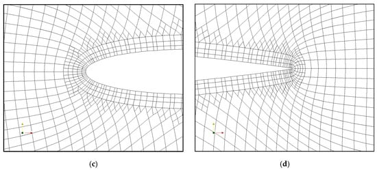 Deformed mesh using the radial basis function (RBF) method. (a) whole domain (side view), (b) near body (side view), (c) around leading edge (side view), (d) around trailing edge (side view).