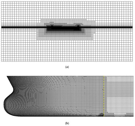 Grid shape for Japan bulk carrier (JBC) resistance calculation. (a) whole domain (side view), (b) surface mesh of fore body (side view).