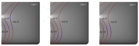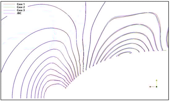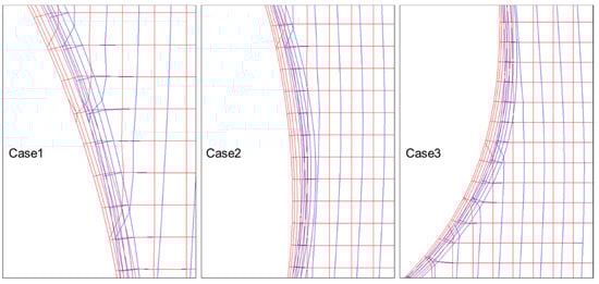 The deformed hull is depicted in Figure 9. The red lines indicate the JBC station lines, whereas the blue lines denote the station lines of the deformed hull. Figure 10 displays a slice of the deformed mesh on the F.P. Because of the small deformation, the variation in mesh quality is small enough to be ignored. The time to deform a mesh with 2 million cells is approximately 118–120 s with a core of Intel Xeon CPU E5-2630 v3 2.4 GHz. The turnaround time is reasonably small. The mesh deformations and CFD simulations are conducted by shell script.
