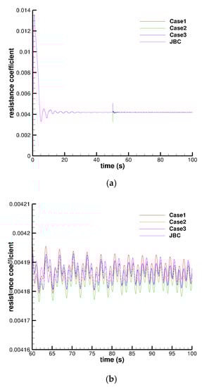 The resistance histories of the JBC and deformed hulls are compared in Figure 11. The calculations of deformed hulls converged much faster than the JBC calculation because the result of the JBC calculation was used as the initial condition for the deformed hull resistance calculations. The calculation of the JBC resistance took approximately 60 s, whereas the calculation of deformed hulls took 20 s in flow time. The variations in the resistances are small because the hull form variation is small. The resistance coefficients are compared in Table 4.