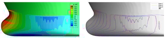 Comparison of pressure distributions around the bow (left: JBC only, right: JBC and deformed hull).
