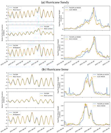 The Finite Volume Community Ocean Model (FVCOM) [27,28] was used to hindcast historical storm events in LIS. FVCOM is an unstructured-grid, 3D primitive equation ocean circulation model. FVCOM was coupled to an adapted Simulating Wave Nearshore (SWAN) model [29]. The coupled FVCOM-SWAVE model incorporates the exchange of wave radiation stresses, as well as near-bottom and surface shear stresses [28,30].