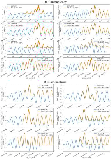 Comparison of water level time series between model (blue) and storm surge sensors from USGS (orange) during hurricane Sandy (a) and Irene (b).