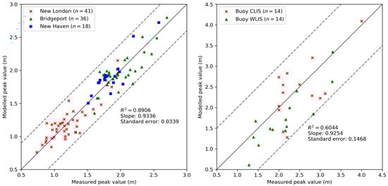 In addition to the time series comparison, the differences between the modeled and observed data were quantified using mean error, RMSE, R, scatter index, standard error, HH index, and Willmot score for New London, New Haven and Bridgeport tide locations (Table 4 and Figure 4). Comparisons between the modeled and observed peak water elevations show good agreement. Although the error statistics for the individual locations were all close to each other, New Haven showed the closest fit and the least bias and scatter. The sample size at each of the stations may have contributed to these results. Overall, good fits were observed at all tide-gauges. The most substantial errors occurred at locations where peak levels were affected by water flow restrictions caused by local bathymetry. As the event duration increased, model skill at predicting water levels over the period decreased.
