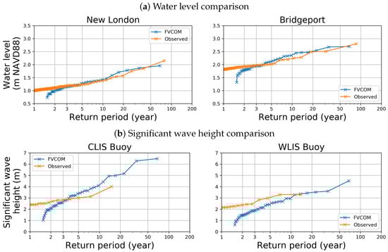 Return periods of observed and modeled water level (a) and significant wave height (b) at the location of observations.