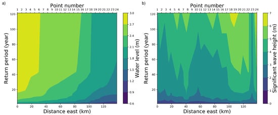 Estimated return level (colored contour) and return period (vertical axis) for water level (a) and significant wave height (b) evaluated at 24 locations down estuary along the Connecticut coast. The point numbers increase from west to east, 1 indicates Greenwich, whereas 24 is Stonington.