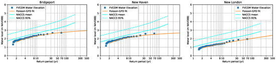 The Generalized Pareto Distribution (GPD) is an asymptotic distribution often used to estimate extreme values above a specific threshold, and the combination of a Poisson distribution and GPD in a peak-over-threshold (POT) framework results in a Generalized Extreme Value (GEV) distribution [37]. This methodology produces distributions of annual maxima, which (in our case) are neither directly observed nor directly modeled. The Poission-GPD method produces the best fit among the generalized extreme value distribution types by minimizing the differences in the empirical distributions between the buoy/gauge observations and the modeled water level results. We applied the Poission-GPD method to the modeled peak water level and significant wave heights from 44 modeled extreme storm events using the MATLAB package WAFO [38]. The individual peak values were obtained from defined storm events with a duration longer than an hour.
