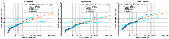 The return period plots of water levels (Figure 7) and significant wave heights (Figure 8) for each town show the model results (dark blue dots), the Poisson-GPD fit (orange line), the mean of NACCS results [45] (light blue line, 95% confidence bound included). The Poisson-GPD fit was calculated using the best fit distribution of the model results. The return period and the corresponding water and wave height levels are listed in Table 5 and the Supplementary Material. Floodwater elevations and significant wave heights for specific events such as 10% (1/10), 3% (1/30), 2% (1/50), 1% (1/100) annual exceedance probability were determined (refer to: Table 5, Appendix A and Appendix B and the Supplementary Materials).