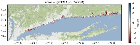 The average error of 100-year water level between model and FEMA estimates. Red indicates that model values are higher than FEMA.