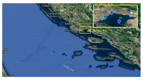 Map of sampling stations (S1–S3) in the Kaštela Bay (Adriatic Sea, Croatia). Longitude and latitude of the sampling stations S1 (16°18′21″: 43°31′40″), S2 (16°21′12″: 43°33′01″), S3 (16°18′21″: 43°31′40″).