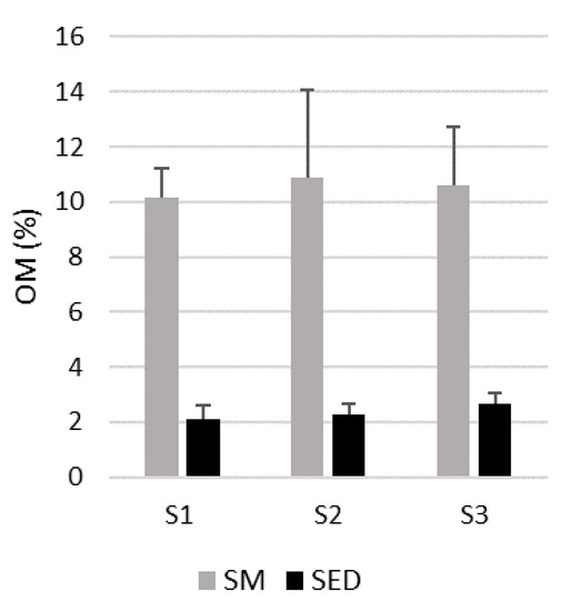The content of organic matter (OM) in all sediment samples shown in Figure 4 ranged from 1.40% (S1, October) to 3.22% (S3, April). Looking at the averages of the individual stations, they ranged from 2.13 ± 0.46% (S1) to 2.65 ± 0.41% (S3), as shown in Figure 5, and the average content for all three stations was 2.35 ± 0.47%.