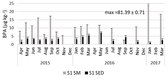 BPA was detected in all sediment samples of the present study, with concentrations ranging from 1.05 µg kg−1 at S1 in January 2017 to 46.31 µg kg−1 at S2 in March 2016 (Figure 6) with an average value 4.37 ± 6.47 µg kg−1 for all stations. In suspended matter, BPA concentration ranged from 1.84 µg kg−1 at S1 in September 2016 to 81.39 µg kg−1 at S1 in January 2017 (Figure 6), with an average 14.77 ± 18.39 µg kg−1, which is approximately three times higher than the value determined for the sediment samples.