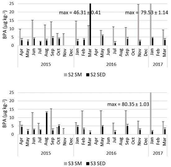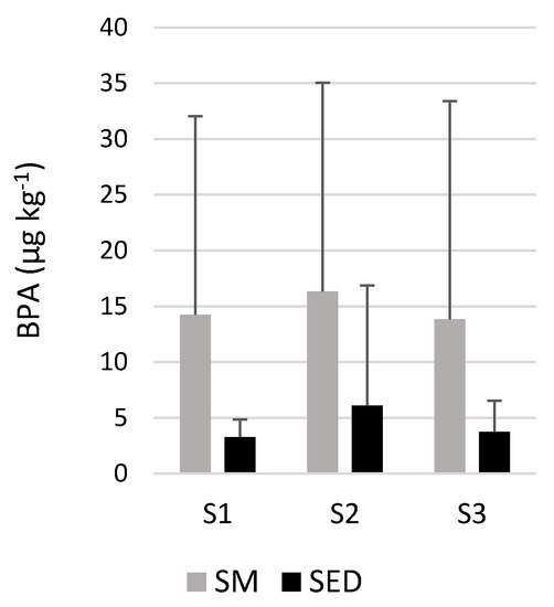Maximum sediment BPA concentrations were observed at station S2 with an average of 6.09 ± 10.78 µg kg−1 (Figure 7), which is about 60% higher than at the other two sampling stations. The average values for stations S1 and S3 were 3.28 ± 1.58 µg kg−1 and 3.75 ± 2.78 µg kg−1, respectively. Similar to the sediment sampling results, the highest BPA values in the suspended matter were found at station S2 (average 16.33 ± 18.70 µg kg−1). It should be noted that this was also the highest average value recorded for all samples (both sediment and suspended matter) from all stations investigated.