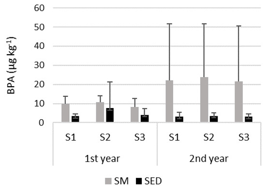 The average annual BPA concentrations were calculated for all stations individually; the results are shown in Figure 8. The sediment samples showed that the yearly average was in the range of 3.14 ± 1.45 µg kg−1 for S3 (April 2016 to March 2017) to 7.61 ± 13.62 µg kg−1 for S2 (April 2015 to March 2016) and the suspended matter content was in the range of 8.09 ± 4.55 µg kg−1 for S3 (April 2015 to March 2016) to 23.70 ± 27.96 µg kg−1 for S2 (April 2016 to March 2017). The highest BPA levels were measured at station S2 in both sediment and suspended matter samples, which may indicate higher BPA contamination in this area.