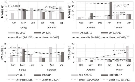 Given the relatively high variability of BPA concentrations during the study mentioned above period, no seasonal changes in the monthly distribution of BPA in sediment and suspended matter were observed. To confirm this statement, a linear regression analysis of BPA concentrations during the cold (October to March) and warm season (April to September) was performed. The analysis presented in Figure 9 showed no trend of an increase or decrease in BPA concentration values during the seasons. The absence of statistically significant correlations within the seasons did not imply a trend of an increase or decrease in BPA concentrations.