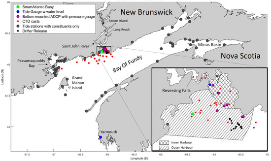 The Port of Saint John was selected as the study site, in part because of its complicated regional oceanography. The port is in Saint John Harbour (hereafter SJH) located in the Bay of Fundy (Figure 1). The area presents tides among the largest in the world, with a maximum range reaching 16 m in the upper Bay of Fundy [27]. The tidal range in SJH can exceed 8 m at spring tide [28,29]. SJH receives significant freshwater influx from the Saint John River (hereafter SJR) which ranges from about 500 m3 s−1 during summer low-water conditions [29] to a maximum of about 10,000 m3 s−1 during the spring freshet [30]. The combination of tidal flow and river runoff generates sharp density fronts which propagate through the vicinity of the port. Due to the large tidal amplitudes in the SJH and throughout the Bay of Fundy, there are significant inter-tidal zones (tidal flats) in the area. The local geography also leads to a complex flow system in the estuary. As SJR discharges into the harbour, water flows over a shallow sill into the Reversing Falls (see inset in Figure 1), a gorge in which rapids usually reverse in direction. Above the sill, the river expands into a river system that receives fresh water input from a large watershed that includes many lakes, hereafter called the river estuary. The Reversing Falls sill, between the harbour and the river estuary, constrains the upstream propagation of tides into the river estuary [28]. The flow conditions in the Reversing Falls change dramatically over the course of a tidal cycle, with the flow alternating between upstream and downstream. Typically, during the flood tide, the sea level in the harbour rises above the water level in the river estuary and there is a strong flow of saline water into the river system [31]. During the ebb tide, the sea level in the harbour drops to a lower level than in the river estuary and a mix of river and sea water flows back out into the harbour [31]. During freshet conditions, if river levels are sufficiently high, the river discharge dominates the flow through the Reversing Falls, such that there is no reversal of the flow. In the river estuary, a two layer system of fresher surface water and brackish bottom water, with a salinity of up to 20 ppt [28], is established in Long Reach (shown in Figure 1) and is present for most of the year, except during the spring and fall freshets when it may be flushed away [28,32]). In winter, the ice is present on the river estuary, but only thin ice appears near the shore in the harbour [28].