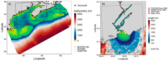 A high-resolution coastline dataset provided by the CHS was used to define the coastline represented in FVCOM and each component of NEMO. The model bathymetry within the Bay of Fundy and part of the Gulf of Maine was interpolated from a high-resolution dataset constructed from CHS and the Ocean Mapping Group, University of New Brunswick (OMG) data sources. Over the area not covered by the CHS/OMG data, NEMO used the global high-resolution SRTM30 bathymetry product [36] and FVCOM used bathymetry from the Scotia-Fundy-Maine grid of WebTide. As a wetting/drying scheme is unavailable in NEMO version 3.6, several modifications were made to the coastline and bathymetry, mainly in the upper Bay of Fundy and in the SJH which has large intertidal areas. Part of the intertidal zone was excluded, and part had the water depth increased to avoid drying and to maintain numerical stability. The modifications ensured the good representation of the M2 tides in and near the SJH [25].