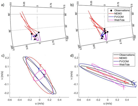 In the above equations, the subscript “o” denotes the observations and “m” denotes the model results. All the variables are defined for a single constituent. In Equations (1) and (2), X represents either the amplitude or phase. In Equation (3), A and φ denote the amplitude and phase of water level, respectively [26]. In Equations (4a) and (4b), Q is the 2D tidal flow (u, v) represented in complex form (with ), t is the time and T is the period of a specific tidal constituent with frequency ω. The other symbols are related to the tidal current ellipse: M is the length of the semi-major axis, ε is the eccentricity (defined as the ratio of the minor axis to the major axis), θ is the orientation, and ψ is the phase of the complex current [46].
