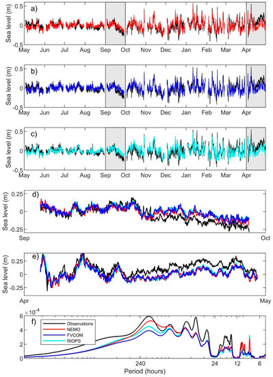 Figure 4 presents the observed and modelled time series of the residual water level at the Saint John tide gauge location and the associated spectra. The shaded areas in Figure 4a–c highlight the time frame of the Fall freshet (September 2015) and the Spring freshet (April 2016), which are shown in detail in Figure 4d,e, respectively. NEMO and FVCOM obtained consistent results for the two freshet events, including the deficiencies after the peak water levels. That is, the modelled water levels were lower than those observed after the peak of the fall freshet, and higher than that observed after the peak of the spring freshet. The causes of these discrepancies were not further explored. The three models (NEMO, FVCOM and RIOPS) all captured the main characteristics of the observed variations of residual water level over a full year period, including similar spectral distributions.