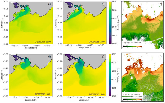 Snapshot of the surface density (kg m−3) from the NEMO (a,d), and the FVCOM (b,e) within 15 min of the satellite-derived images of suspended particulate matter (c,f) provided by E. Devred, Fisheries and Oceans Canada (DFO). The dates and times of the satellite images, as well as the modelled surface density field are indicated.
