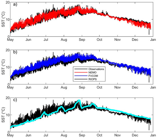 Time series of the sea surface temperature (SST) from (a) the NEMO, (b) the FVCOM, and (c) the RIOPS compared to the observed SST at the SmartAtlantic Buoy. RIOPS times series is based on daily output.