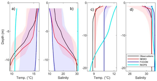 Observed (black) and modelled (NEMO, red; FVCOM, blue; RIOPS, cyan) temperature (a,c) and salinity (b,d) profiles from the representative stations in the inner harbour (a,b) and outer harbour (c,d). The model profiles are taken at the nearest hour to the observations, h. The shaded area around the NEMO and FVCOM profiles (light pink for the NEMO and light blue for the FVCOM) represents the profiles within t − 3 h and t + 3 h to show how the modelled profiles vary over a 6 h period. Where the areas overlap, the shading appears more purple.
