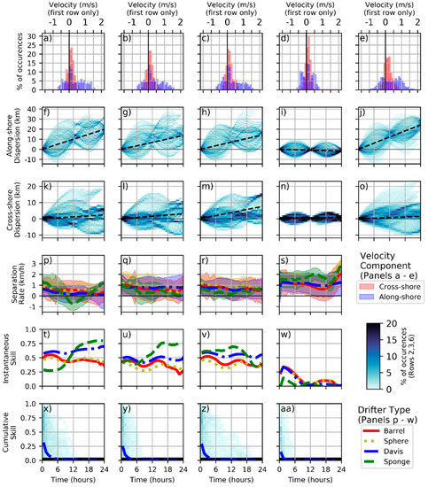 The first aspect of the drift evaluation was to qualitatively compare the distributions of surface velocities derived from the observed and modelled drifter trajectories. Drifter velocity is approximated as a forward Euler difference between the successive positions and reported in along-shore (241°T positive) and cross-shore (151°T positive) components. Note that without including the wind effect, the “drifter velocity” from the models are very close to the surface currents. Figure 9a–e shows the distributions of drifter velocities for the Davis drifters, but the results were similar for all drifter types. The mean and RMS speeds derived from these distributions were within a few percent of each other for all cases, and the shapes of the distributions were generally similar. However, the distribution of the observed drift velocities appears to have heavier tails than the modelled drift velocity distributions, which is consistent with the underprediction of currents noted in Section 3.5. As expected, the distributions based on WebTide were more bi-modal (consistent with ebb and flood tide) in the along-shore direction and more peaked around 0 in the cross-shore direction. They showed no mean speed, and underpredicted the variability in the drift speeds. Such consequences of WebTide having no baroclinic flow was evident here, as well as across all the evaluations of the drifter trajectories (panels d, i, n, s, w, aa of Figure 9). Therefore, the WebTide-based results are not discussed further in this paper.