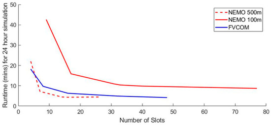 The evaluation of model efficiency included a comparison of (1) the number of cores and run-time required to run the models, and (2) the scalability of the models which describes the model’s ability to run faster on more cores. The performance of the two models can be directly compared because both were run on the same high-performance computing platform of the Government of Canada. Both the NEMO and FVCOM models for Saint John Harbour met the operational requirement (a 48 h simulation in less than 30 min), but the FVCOM model had much less computational cost overall. For a 48 h simulation, the FVCOM used eight slots (24 cores per slot) with a run-time of 19.5 min; and the three-level nested NEMO model used 31 slots with a run-time of 29.1 min. The high computational cost of NEMO was mainly due to the 100 m configuration (SJAP100). Figure 10 shows that the run time of SJAP100 rapidly decreased when the number of slots increased from 10 to 18, and then gradually decreased with an increasing number of slots. For the FVCOM, the rapid decrease in run time occurred as the number of slots increased from 5 to 8. The scalability curve for the 500 m configuration of the NEMO (BoF500) is closer to that of the FVCOM. The requirements on the number of computer slots are related to the difference in the numbers of computed nodes (grids) among different models: the FVCOM has 56,635 nodes and 108,301 elements, while SJAP100, BoF500 and BoFSS1/36 have 466,718, 161,670 and 39,600 grid points, respectively. This demonstrated a major computational efficiency in using the unstructured grid FVCOM over the structured NEMO for nearshore applications. Despite having a higher resolution in SJH, the FVCOM ran faster than SJAP100.