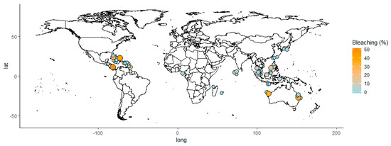 Our first dependent variable is coral bleaching. Coral bleaching can have five causes: (1) changes in sea temperature (either elevated or decreased); (2) solar radiation; (3) reduced salinity; (4) bacterial and other infections; (5) combination of elevated temperature and solar radiation [41]. We were able to match management and conservation data for 61 MPAs (Figure 1). The MPAs with the largest proportions of bleached coral colonies are found in the Caribbean and around Australia; the highest proportion of bleached colonies in our sample is located in an MPA off the shore of Honduras (49%). A relatively large share of MPAs (28.3%) reported no bleaching of any coral colonies in the population.
